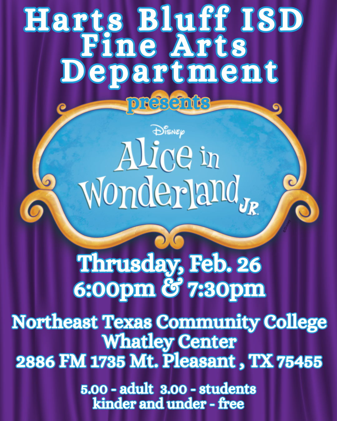 Join the Harts Bluff Fine Arts Department as they present Alice in Wonderland Jr.  Come support our talented students as they bring this classic story to life on stage. It’s sure to be an evening full of creativity, imagination, and outstanding performances!